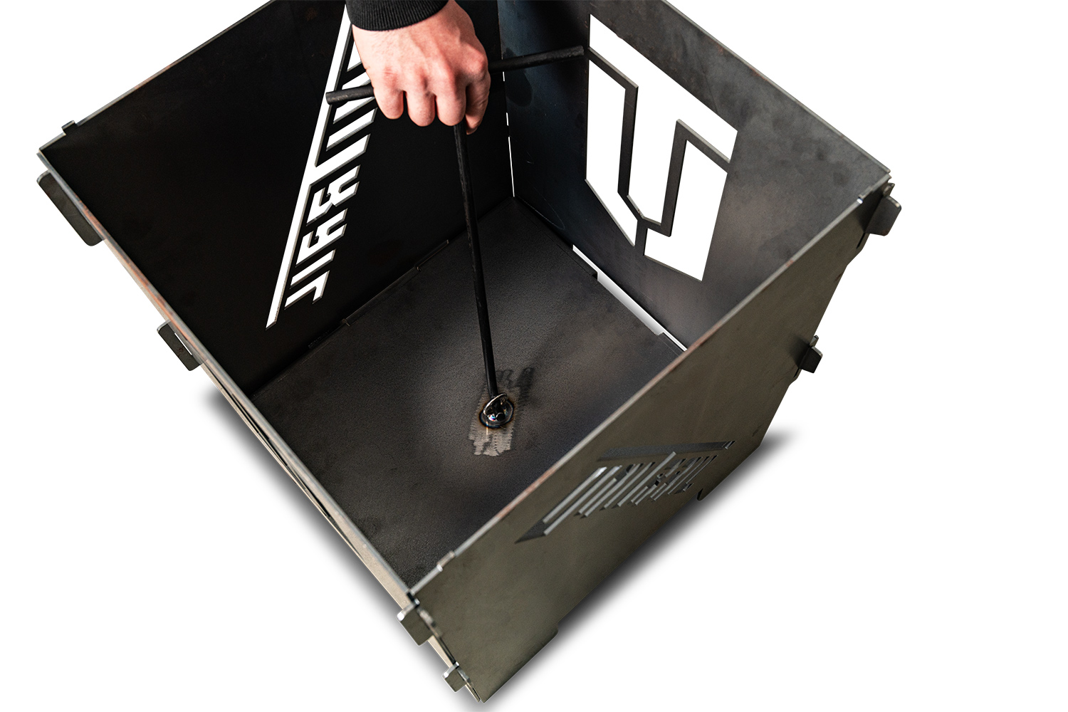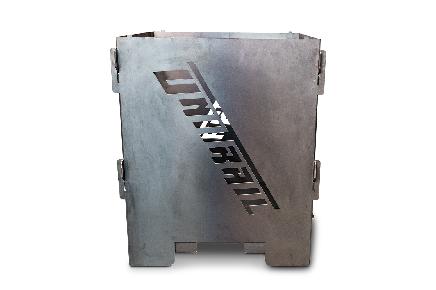Kompakte Feuertonne aus 3 mm Stahl, mit gelasertem UNITRAIL Logo und praktischem Ascheauffangblech. Ideal für Terrasse, Garten und Camping.